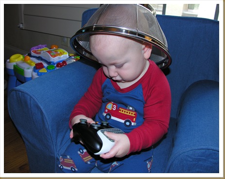 Colander hat and an XBOX 360 controller...what more can a little boy ask for?